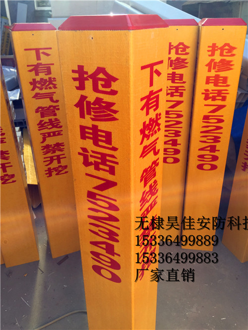 玻璃钢标志桩:经高温压制而成。抗冲击,耐磨损,耐高温,耐腐蚀,可以抗水、汽油、酒精、电解盐、醋酸、盐酸、钠钾化合物、尿、沥青,适合各种酸碱土壤。使用寿命长达30年。内容采用丝网印刷技术,警示效果好,不需要维护。重量轻,便于运输安装。无回收价值,自然防盗。