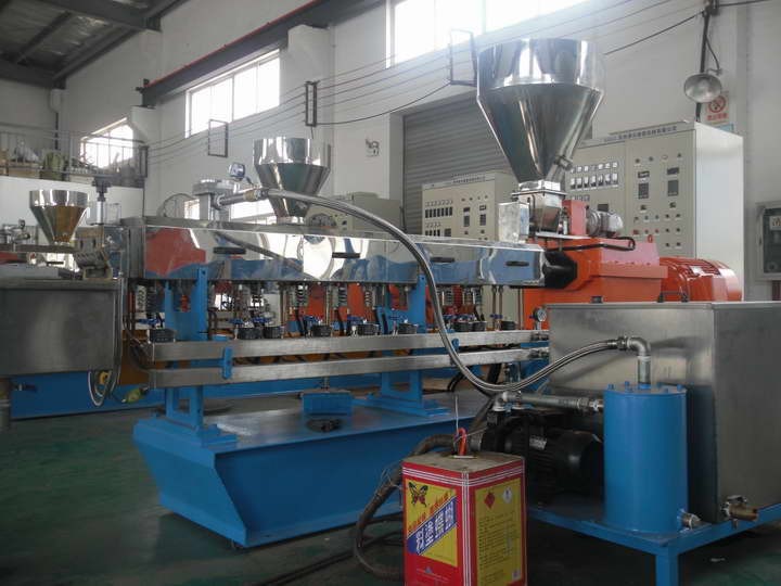 3.改性造粒机:为造粒主机,其功能是将密炼机混炼好以后的胶料经过二次分散推送至切粒模头切粒,因在推送过程中需要保证胶料的温度所以一般设有五个温度控制区,用以调节胶料温度配合切粒机切粒成型。