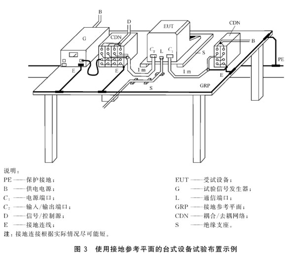 在进行试验时,信号发生器、耦合/去耦网络、EUT和辅助设备应接到参考接地平面(GRP),或以其他适当的方式接地。