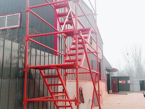 横杆的安装方法是以头一条为基础,对面1.5米处再装一条(横杆用来放置楼梯的,楼梯的垂直高度为1.5米),以此类推对面每隔1.5米装一条(一个立体面上间隔3米装一条)。楼梯的安装和横杆同步进行:直接将楼梯放置在已安装好的横杆上,摆正放好即可,头一层楼梯靠右边置放。转角平台大的方向放在下面,转角平台小的方向放在上面。