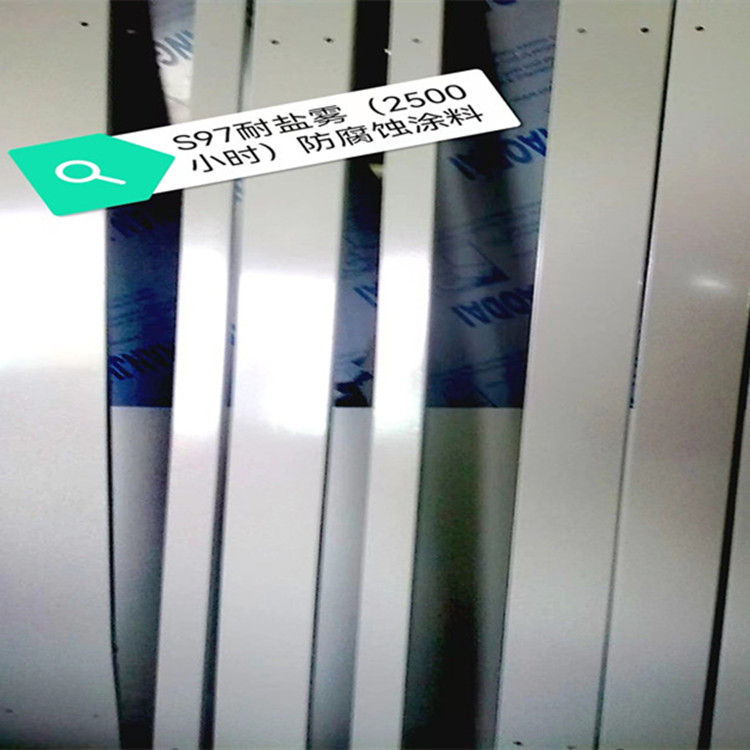 S97涂料是一种用于沿海钢铁结构和设施的新型外防腐涂料。涂料底漆采用环氧树脂为主要成膜物质,氧化铁红为主要防锈颜料;面漆为聚氨酯丙烯酸酯涂料。性能试验证明,S97涂料具有优良的物理机械性能、耐水性、耐盐水性、耐酸性、耐油性、耐盐雾、耐湿热和耐老化性能。